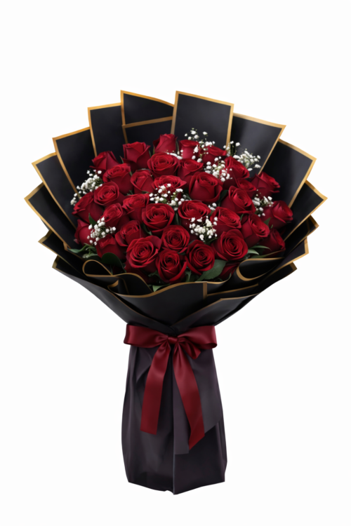 Gold Şeritli Siyah Ambalajda Modern Kırmızı Gül Tasarımı