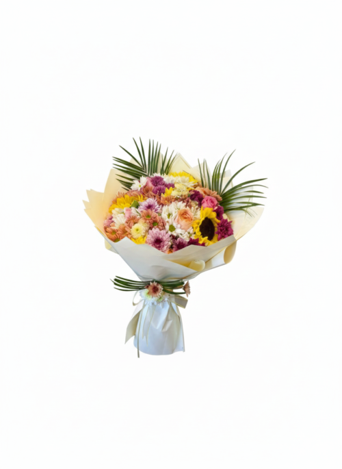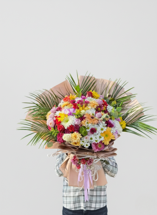 Egzotik Palmiye Yapraklı Renkli Mevsim Çiçekleri Buketi