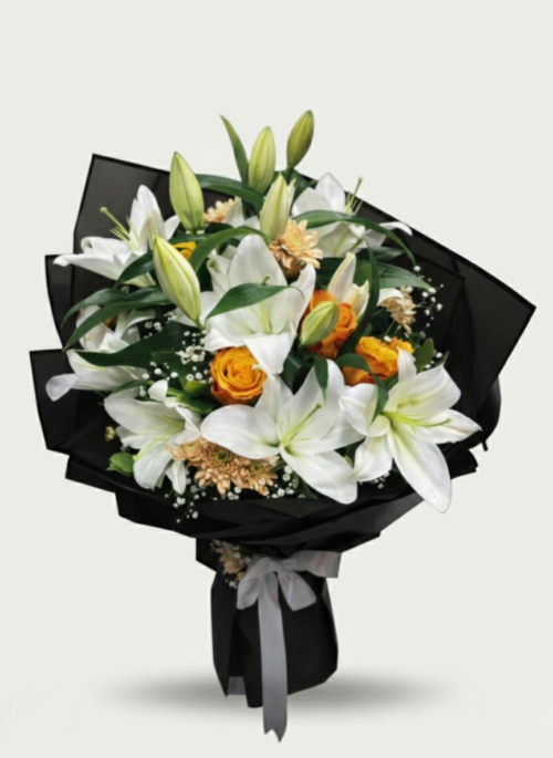 Siyah Ambalajda Asil Beyaz Lilyum ve Turuncu Gül Buketi