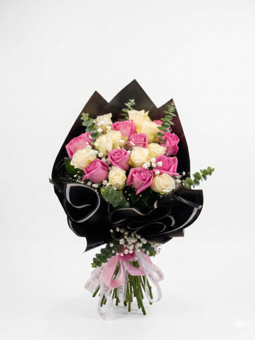 Siyah Saten Ambalajda Pembe ve Beyaz Gül Tasarımı